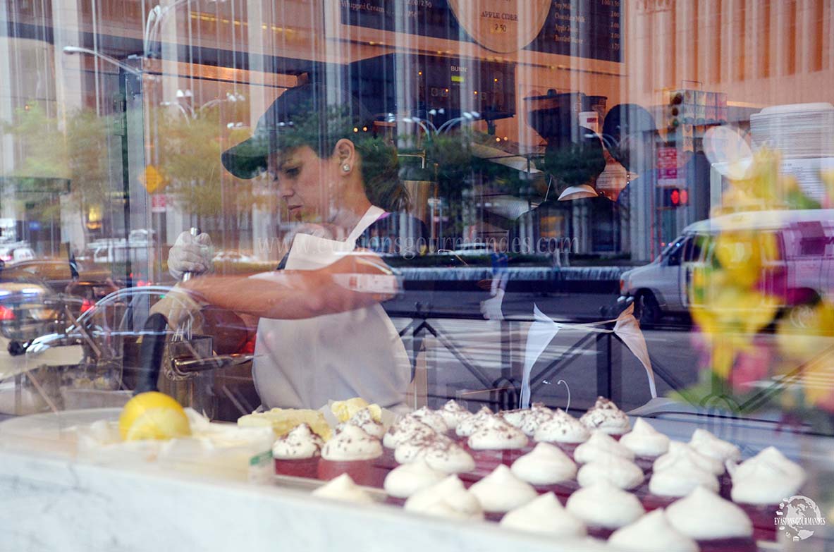 J’en ai également profité pour observer le coup de main particulier qui fait tout le charme et la beauté des cupcakes de Magnolia Bakery. Ici, pas de poches à douille ! Les pâtissières utilisent une spatule, et en quelques secondes seulement, décorent les délicieux petits gâteaux.